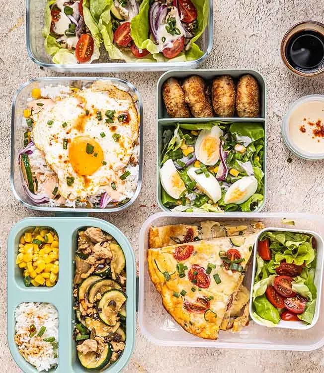 Dieselbe Pfanne wie für die Zucchini nutzen, um zwei Spiegeleier zu braten. Joghurt mit Paprikapulver und Kikkoman Sojasauce verrühren. Zwiebel schälen und würfeln. Ein Viertel des gekochten Reises in eine Lunchbox schichten, dann jeweils die Hälfte Zucchini, Mais und Zwiebel darauf geben und mit einem weiteren Viertel des Reises bedecken. Die Hälfte der Joghurtsauce darüber gießen. Diesen Vorgang für die zweite Lunchbox wiederholen.