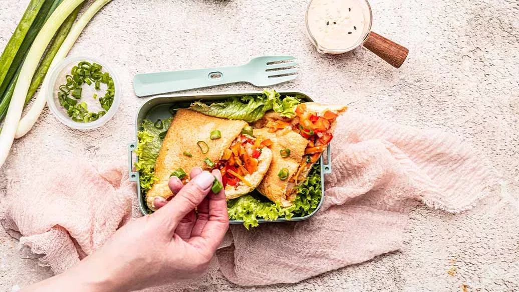 Die Frühlingszwiebel hacken. Das Omelett in der Hälfte falten und in eine Lunchbox legen. Mit der Mayonnaise-Sriracha-Sauce und den Frühlingszwiebeln servieren.