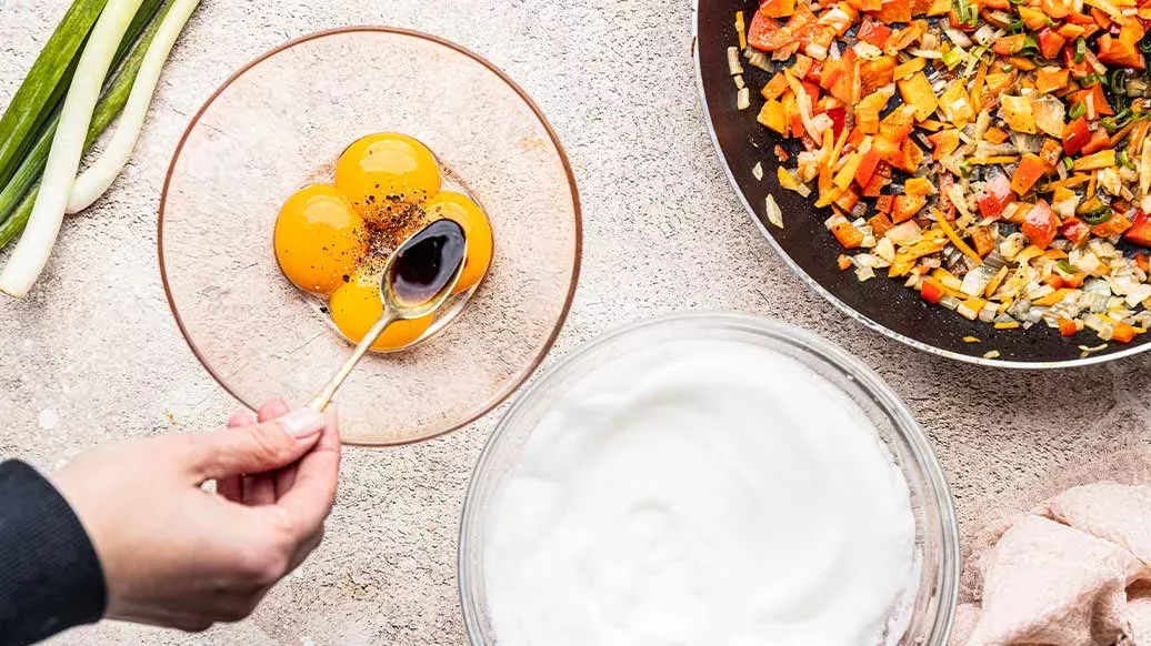Das Eiweiß von den Eigelben trennen, in eine große Schüssel geben und steif schlagen. Eigelb mit Kikkoman Sojasauce und Pfeffer vermengen und auf niedriger Stufe mit dem Eischnee verquirlen. Mehl hineinsieben und vorsichtig unterrühren.