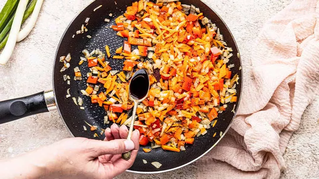 Karotte und Paprika in Stifte schneiden und die Zwiebel sowie die Frühlingszwiebel hacken. Die Zwiebel in Öl goldgelb anbraten, Karotten zugeben und kurz danach die Paprika und Kikkoman Sojasauce. Zum Schluss pfeffern, mit den Frühlingszwiebeln bestreuen und beiseitestellen.