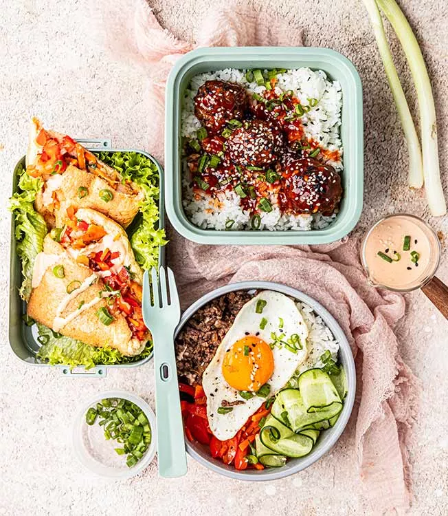 Wie wäre es mit einem vegetarischen Omelett zum Start in den Tag und Rindfleischbällchen in einer würzigen Sauce als Hauptmahlzeit? Oder doch lieber eine Bowl mit Fleisch, frischem Gemüse und Reis? Drei Mahlzeiten, die man ohne viel Aufwand in einem Rutsch zubereiten kann!