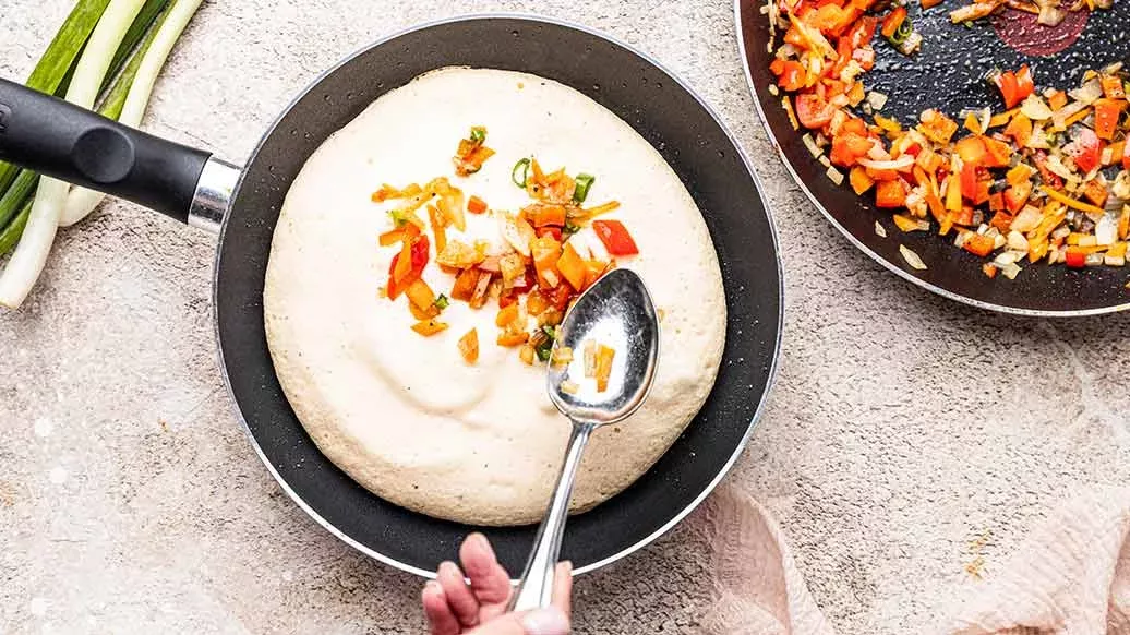 Das Öl in einer Bratpfanne erhitzen und gut verteilen. Die Hälfte des Omelett-Teigs hineingeben, bei schwacher Hitze 1 bis 2 Minuten braten, dann die Hälfte des Gemüses darauf geben. Deckel auf die Pfanne setzen und etwa 4 Minuten bei schwacher Hitze weiterbraten. Herausnehmen und das zweite Omelette genauso zubereiten.