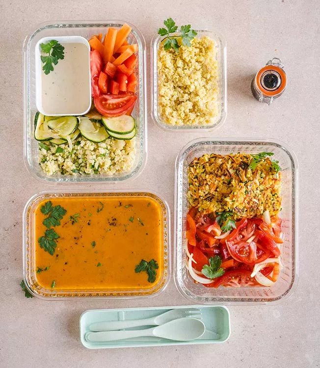 Karotte in Stifte, Tomate in Viertel und Paprika in Würfel schneiden. Alle Zutaten in eine Lunchbox geben.
