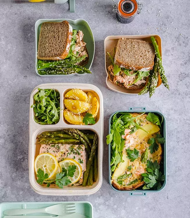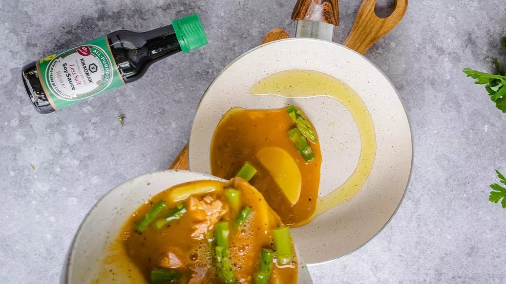 4 Eier – 1 EL Kikkoman natürlich gebraute salzreduzierte Sojasauce – 1 TL Pfeffer – 60 g gekochte Kartoffeln – 0,25 Bund grüner Spargel – 150 g gebackener Lachs