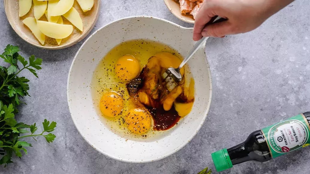 Eier, Kikkoman Sojasauce mit weniger Salz und Pfeffer mit einer Gabel verquirlen. Kartoffeln in Scheiben, Spargel in Stücke, Lachs in Würfel schneiden und mit der Eimasse vermengen.